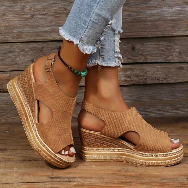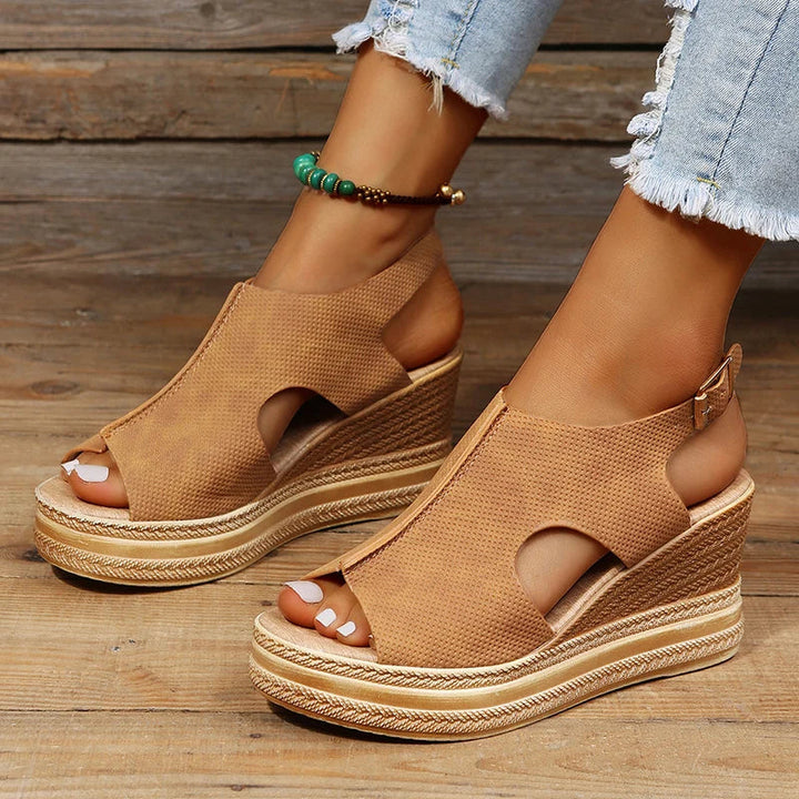 Introducing our Women's Buckled Platform Sandals. These stylish sandals boast a clean, crisp look with a secure buckle closure that ensures a perfect fit.